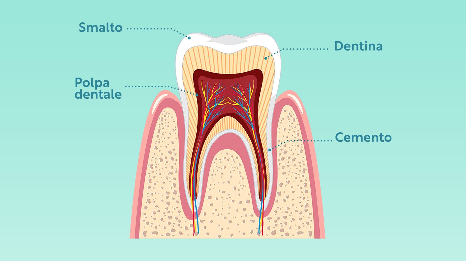 Il dente è composto principalmente da quattro tessuti fondamentali: smalto, dentina, polpa dentale e cemento. Ciascuno di questi ha una struttura e una funzione specifica.